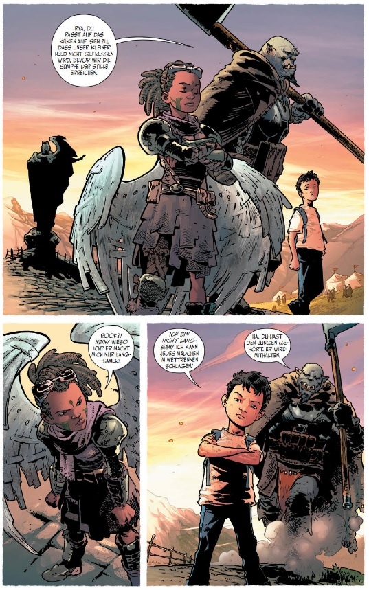 Die Mischung aus blutigen Schlachten, einer kreativen Fantasy-Welt und den bedrückenden Problemen einer Familie in der „realen“ Welt ist unheimlich erfrischend und bietet einen hohen Unterhaltungswert. Während die leicht verständliche Realität einen etwas größeren Raum in diesem Auftakt-Band erhält, bleiben für mich noch einige Fragen bezüglich der phantastischen Welt Terrenos und der in ihre lebenden Geschöpfe offen. Dafür wird man jedoch mit heroischen Bildern, blutigen Schlachten und ausdrucksstarken Mienenspielen der Protagonisten belohnt. Die klassischen Zeichnungen von Andrei Bressan bekommen durch die kräftige Farbpalette von Adriano Lucas das richtige Feeling verpasst, und man glaubt tatsächlich durchs Kaninchenloch bzw. den Wald in eine schillernde Fantasy-Parallel-Welt gefallen zu sein.